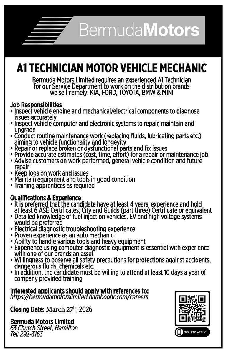 17 Mar 2026 A1 TECHNICIAN MOTOR VEHICLE MECHANIC Posted in By Jobs in Bda On March 17, 2026 Full Time Anywhere Posted 50 minutes ago Mar 17, 2026