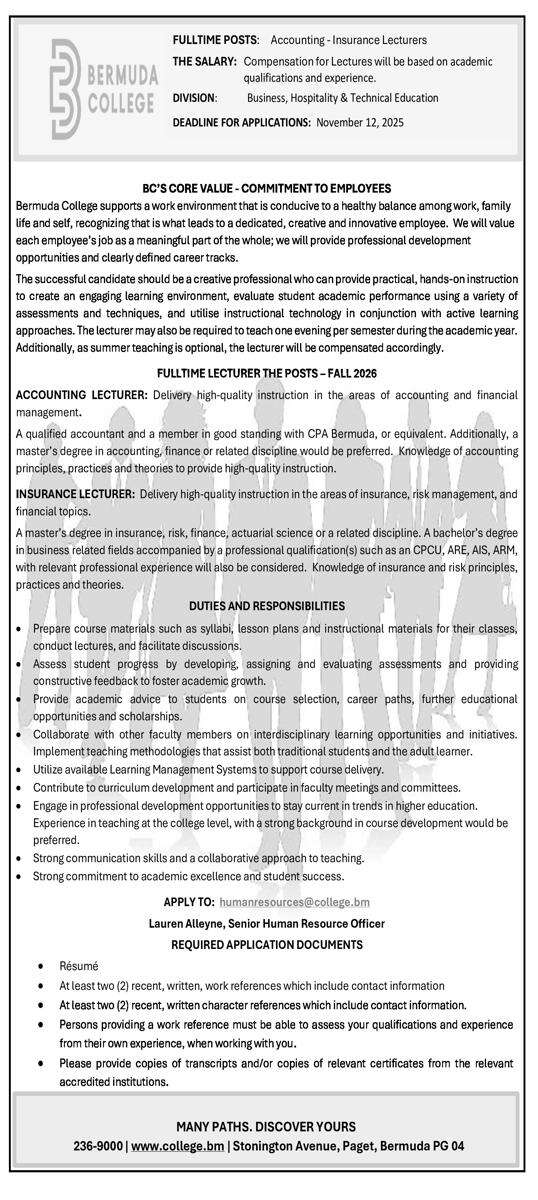 30 Oct 2025 Accounting and Insurance Lecturers Posted in By Jobs in Bda On October 30, 2025 Full Time Anywhere Posted 1 day ago Oct 30, 2025