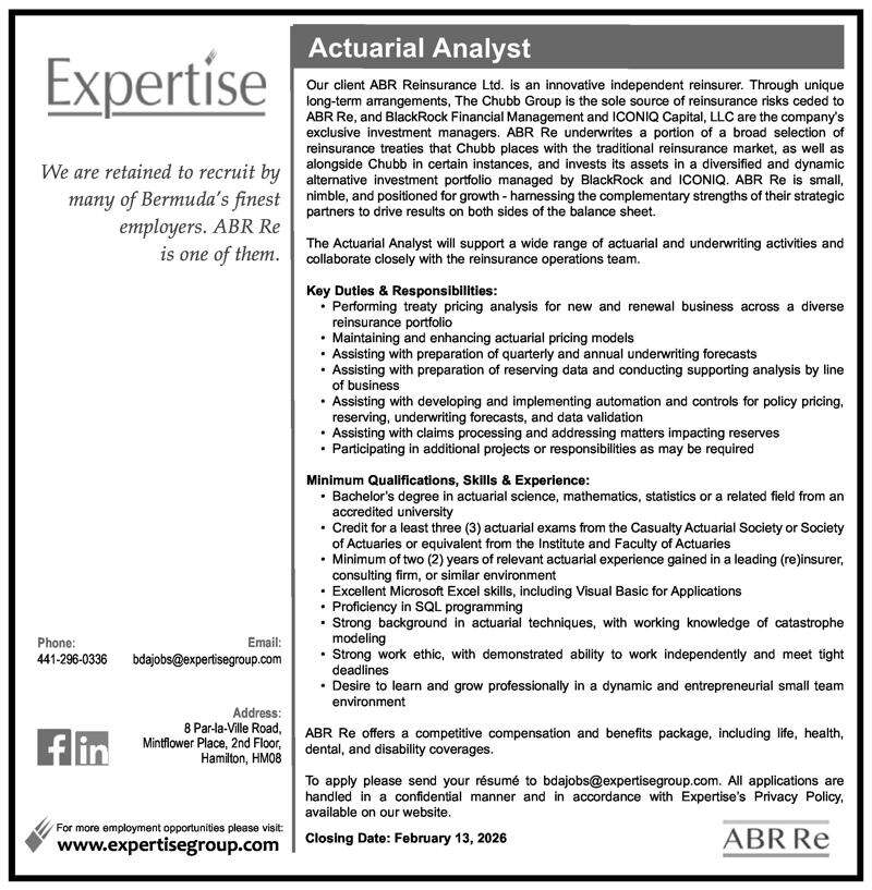 30 Jan 2026 Actuarial Analyst Posted in By Jobs in Bda On January 30, 2026 Full Time Anywhere Posted 1 day ago Jan 30, 2026