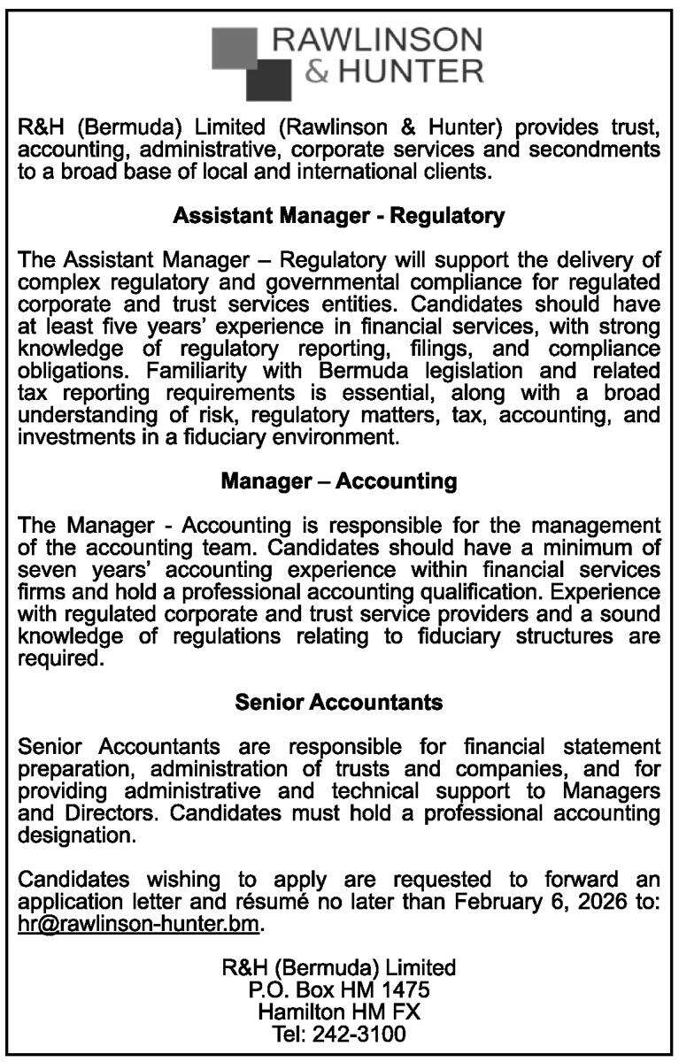 30 Jan 2026 Assistant Manager – Regulatory, Manager – Accounting and Senior Accountants Posted in By Jobs in Bda On January 30, 2026 Full Time Anywhere Posted 15 minutes ago Jan 30, 2026