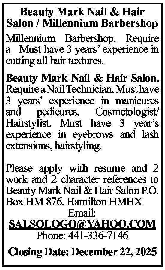 15 Dec 2025 Barber – Nail Technician Posted in By Jobs in Bda On December 15, 2025 Full Time Anywhere Posted 1 day ago Dec 15, 2025