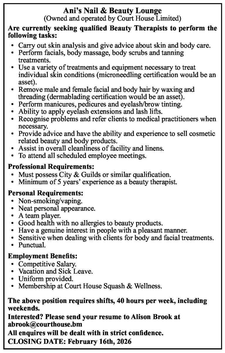 30 Jan 2026 Beauty Therapist Posted in By Jobs in Bda On January 30, 2026 Full Time Anywhere Posted 3 minutes ago Jan 30, 2026