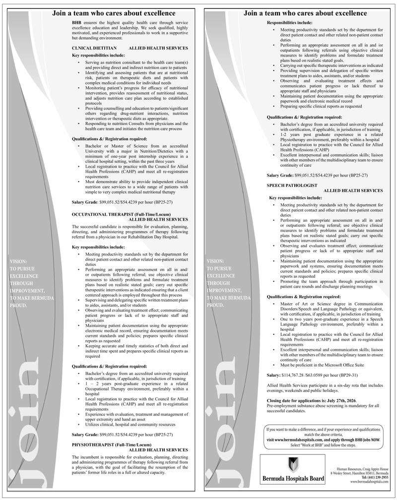 30 Jan 2026 CLNICAL DIETITIAN, OCCUPATIONAL THERAPIST, PHYSIOTHERAPIST (Full-Time/Locum) and SPEECH PATHOLOGIST Posted in By Jobs in Bda On January 30, 2026 Full Time Anywhere Posted 1 day ago Jan 30, 2026