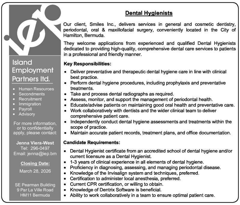 20 Mar 2026 Dental Hygienist Posted in By Jobs in Bda On March 20, 2026 Full Time Anywhere Posted 30 minutes ago Mar 20, 2026