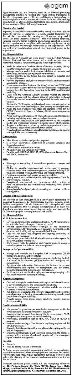 30 Oct 2025 Director of Actuarial – Director of Risk Management – ALM & Investment Risk and more: Posted in By Jobs in Bda On October 30, 2025 Full Time Anywhere Posted 1 day ago Oct 30, 2025