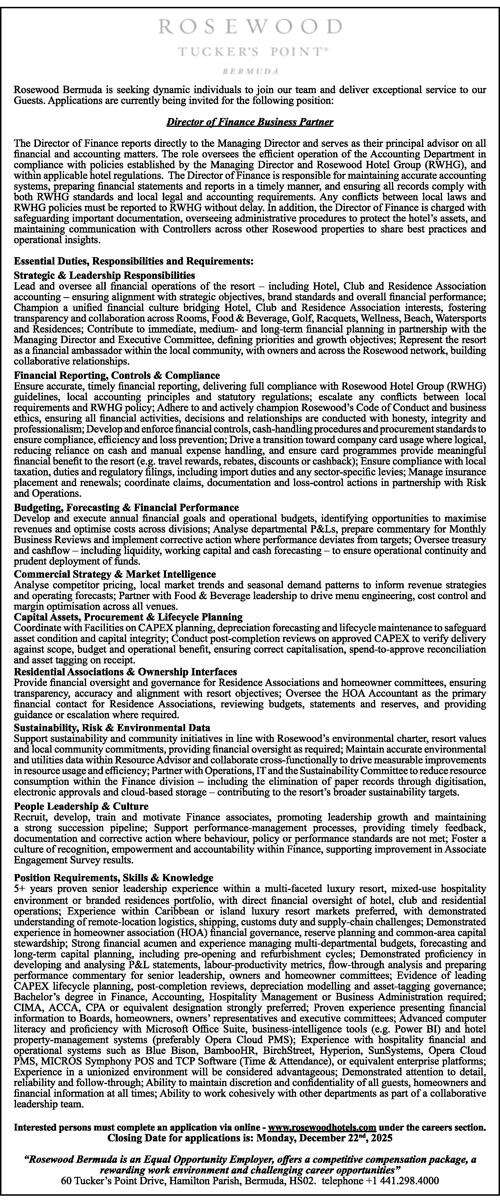 15 Dec 2025 Director of Finance Business Partner Posted in By Jobs in Bda On December 15, 2025 Full Time Anywhere Posted 1 day ago Dec 15, 2025