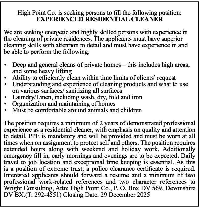 16 Dec 2025 EXPERIENCED RESIDENTIAL CLEANER Posted in By Jobs in Bda On December 16, 2025 Full Time Anywhere Posted 3 minutes ago Dec 16, 2025