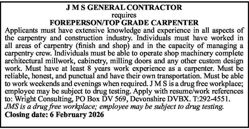 30 Jan 2026 FOREPERSON/TOP GRADE CARPENTER Posted in By Jobs in Bda On January 30, 2026 Full Time Anywhere Posted 17 minutes ago Jan 30, 2026