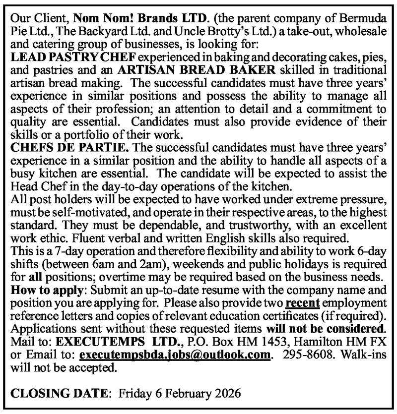 30 Jan 2026 LEAD PASTRY CHEF – ARTISAN BREAD BAKER – CHEFS DE PARTIE Posted in By Jobs in Bda On January 30, 2026 Full Time Anywhere Posted 16 minutes ago Jan 30, 2026