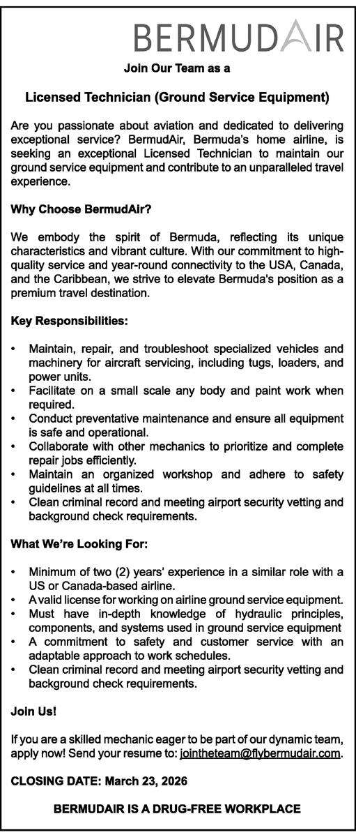 16 Mar 2026 Licensed Technician (Ground Service Equipment) Posted in By Jobs in Bda On March 16, 2026 Full Time Anywhere Posted 1 day ago Mar 16, 2026