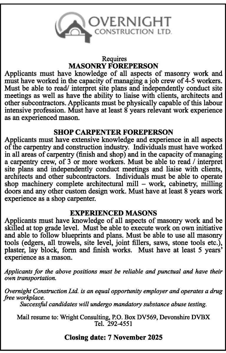Masonry Foreperson, Shop Carpenter Foreperson and Experienced Masons