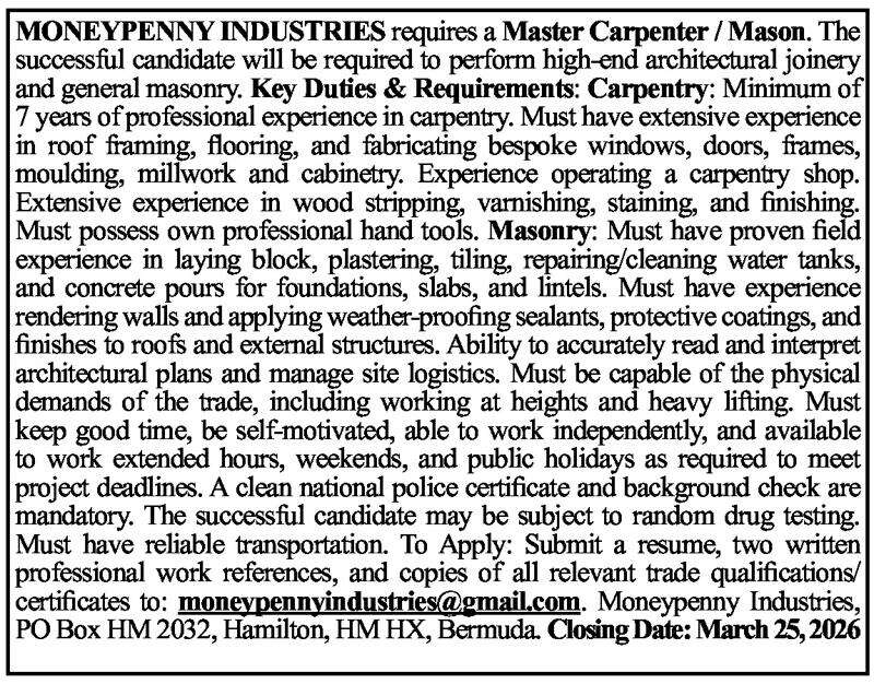 16 Mar 2026 Master Carpenter / Mason Posted in By Jobs in Bda On March 16, 2026 Full Time Anywhere Posted 1 day ago Mar 16, 2026