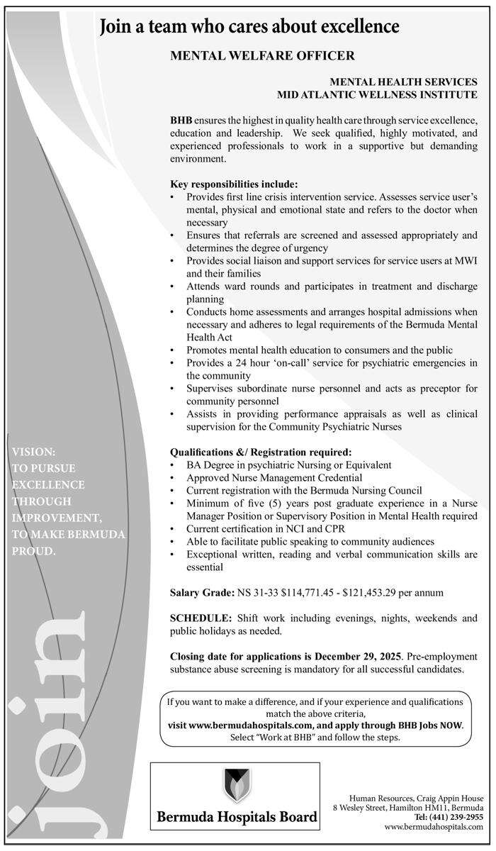 16 Dec 2025 MENTAL WELFARE OFFICER Posted in By Jobs in Bda On December 16, 2025 Full Time Anywhere Posted 4 minutes ago Dec 16, 2025