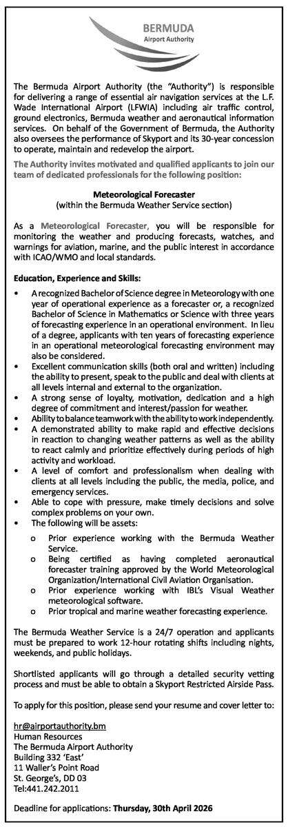 16 Mar 2026 Meteorological Forecaster Posted in By Jobs in Bda On March 16, 2026 Full Time Anywhere Posted 1 day ago Mar 16, 2026