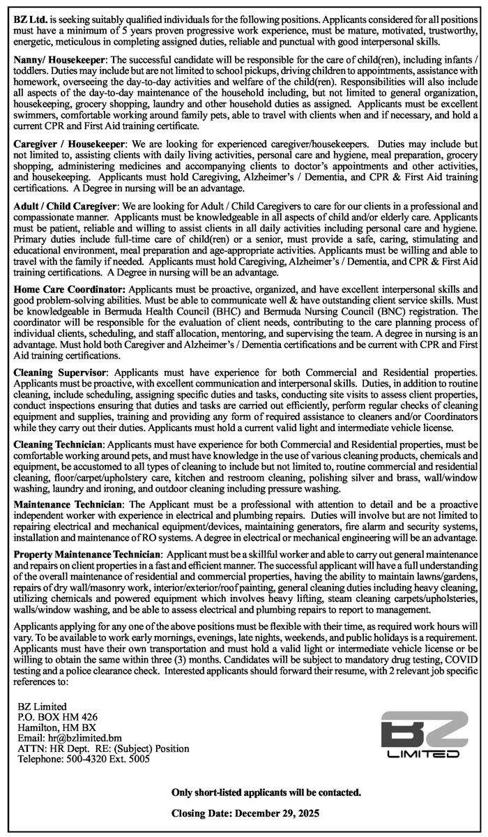 16 Dec 2025 Nanny/ Housekeeper – Caregiver / Housekeeper – Adult / Child Caregiver: Home Care Coordinator and more: Posted in By Jobs in Bda On December 16, 2025 Full Time Anywhere Posted 16 minutes ago Dec 16, 2025