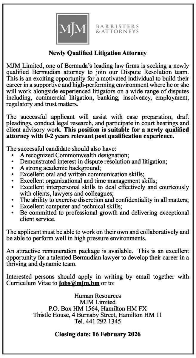 30 Jan 2026 Newly Qualified Litigation Attorney Posted in By Jobs in Bda On January 30, 2026 Full Time Anywhere Posted 1 day ago Jan 30, 2026