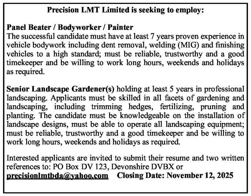 01 Nov 2025 Panel Beater / Bodyworker / Painter – Senior Landscape Gardener(s) Posted in By Jobs in Bda On November 1, 2025 Full Time Anywhere Posted 1 day ago Nov 01, 2025
