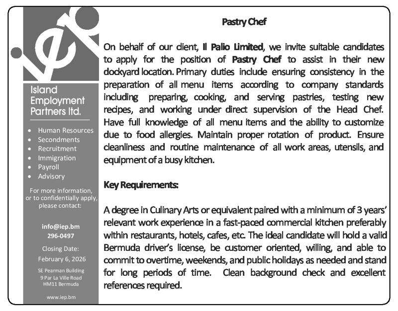 30 Jan 2026 Pastry Chef Posted in By Jobs in Bda On January 30, 2026 Full Time Anywhere Posted 1 day ago Jan 30, 2026