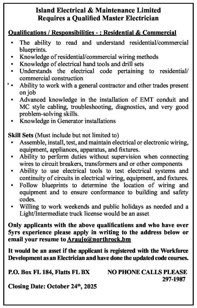 08 Oct 2025 Qualified Master Electrician Posted in By Jobs in Bda On October 8, 2025 Full Time Anywhere Posted 16 minutes ago Oct 08, 2025