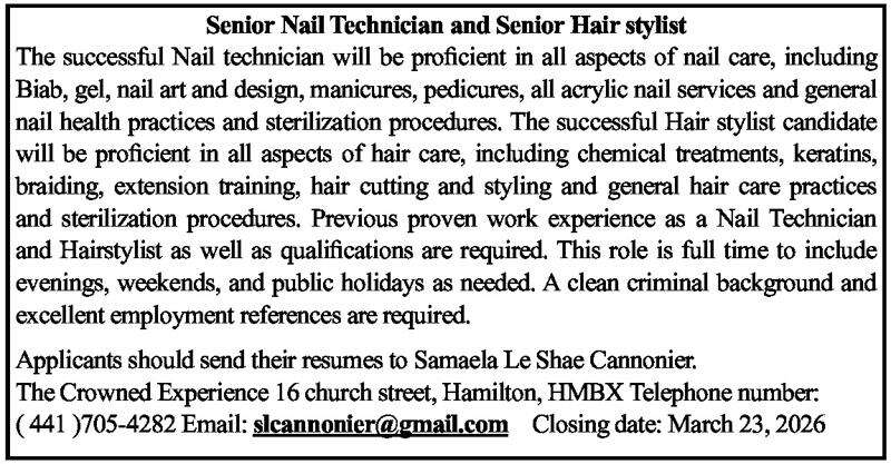 16 Mar 2026 Senior Nail Technician and Senior Hair stylist Posted in By Jobs in Bda On March 16, 2026 Full Time Anywhere Posted 1 day ago Mar 16, 2026