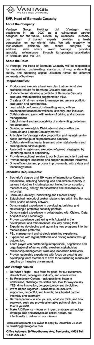 16 Dec 2025 SVP, Head of Bermuda Casualty Posted in By Jobs in Bda On December 16, 2025 Full Time Anywhere Posted 4 minutes ago Dec 16, 2025